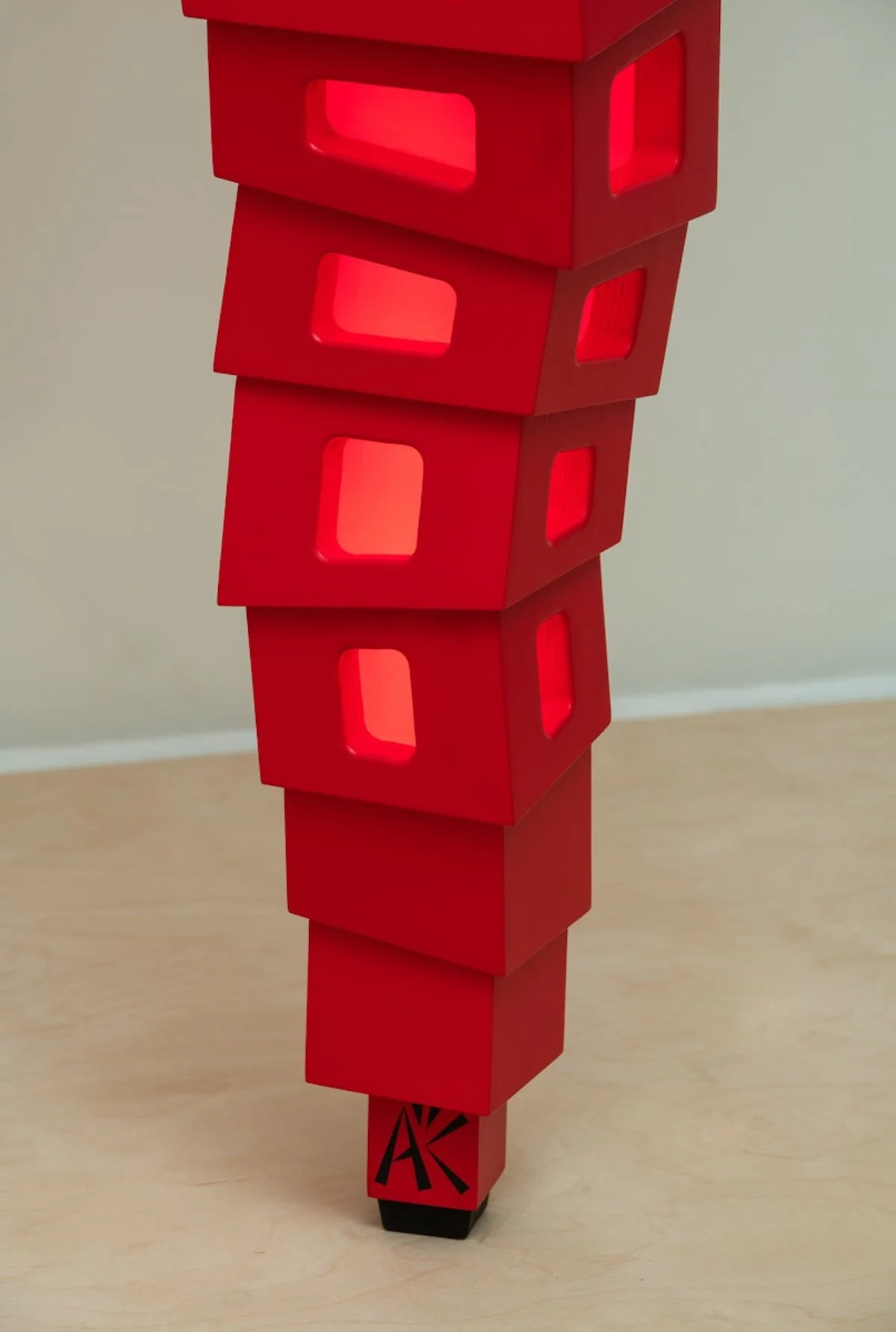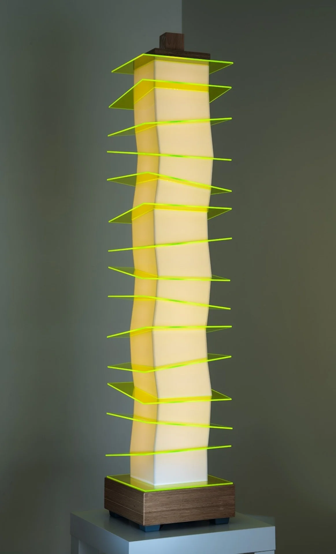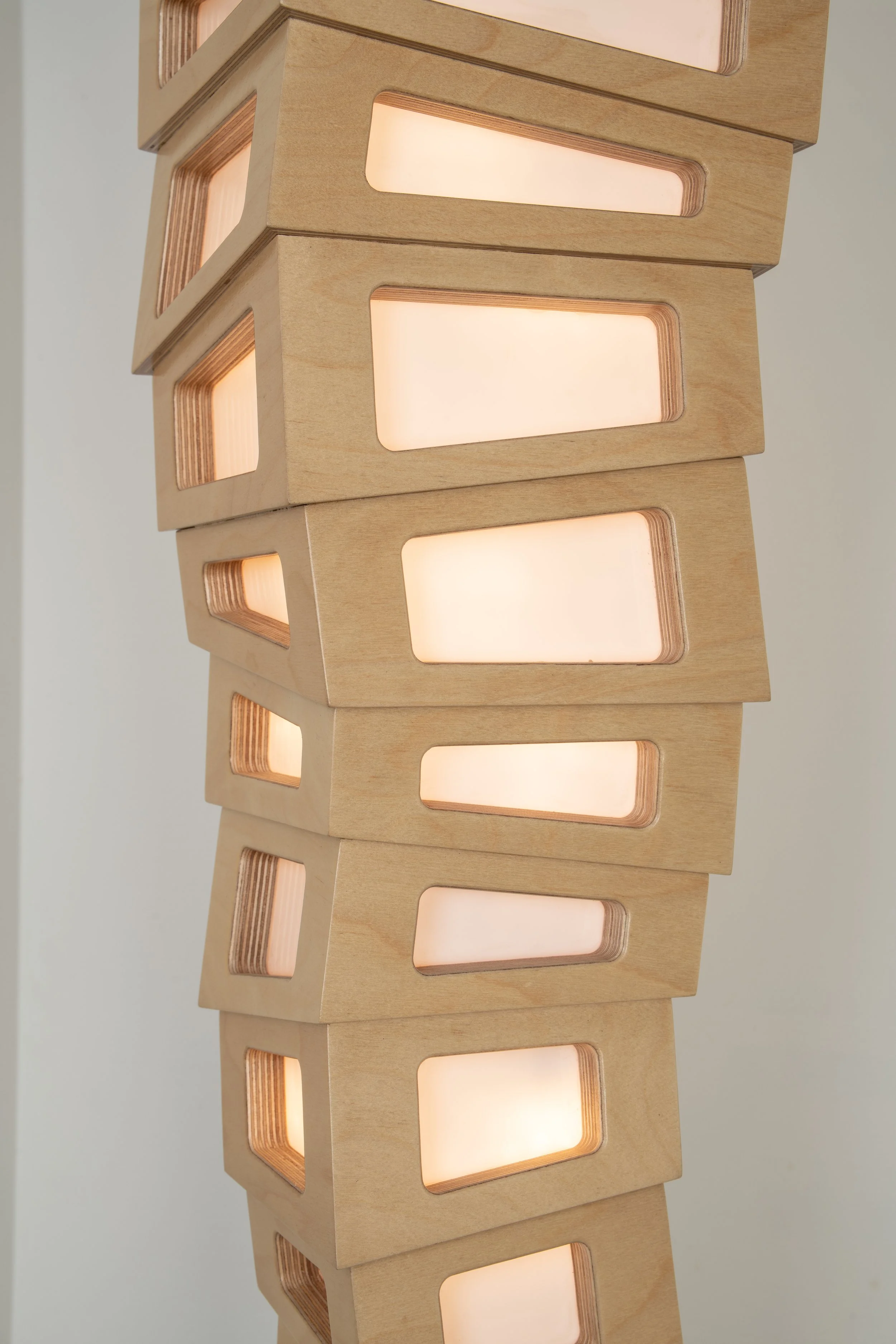 This new variation within the “Chaos Series” of light objects incorporates light transmitting acrylic. This material is sandwiched between each component of its wood body. The goal was to add visual interest by literally highlighting the contours of the form. It makes use of a 24 volt LED lighting system and a special bulb designed for even light distribution.