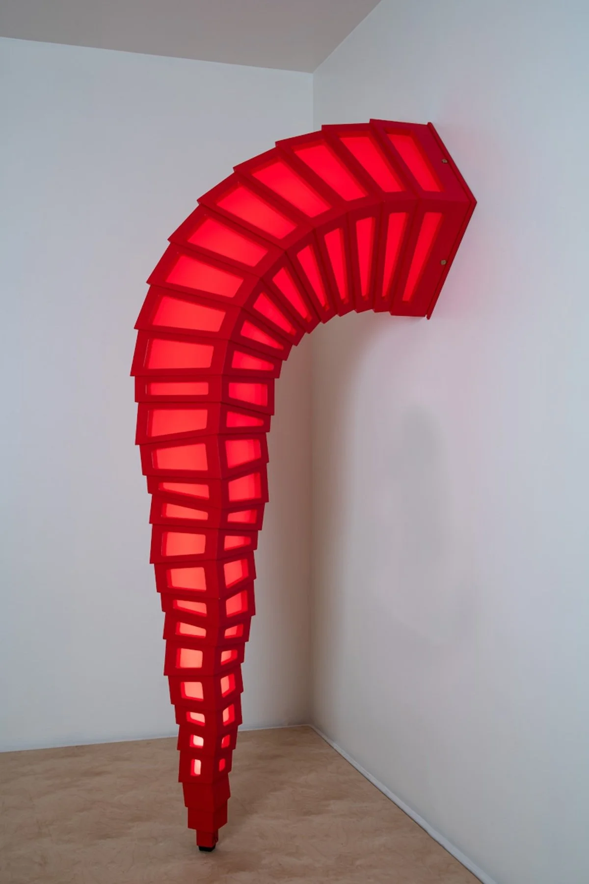 This unique light object relies on both a vertical and horizontal and vertical surface for display. A custom 24 volt LED light source provides even illumination and is fully dimmable to suite both the space and the mood of viewer. Work is designed to be plugged in to a standard (U.S.) 110 power receptacle. For a cleaner look the option exists for it to be mounted in a manner (pictured) in which no wires are exposed. Essentially this involves installing a recessed power source behind that wall where work is mounted. This would ideally be controlled by a conveniently located dimmer switch or remote. Wormhole in currently available in a clear semi-gloss finish over baltic birch or solid semi-glass white finish.