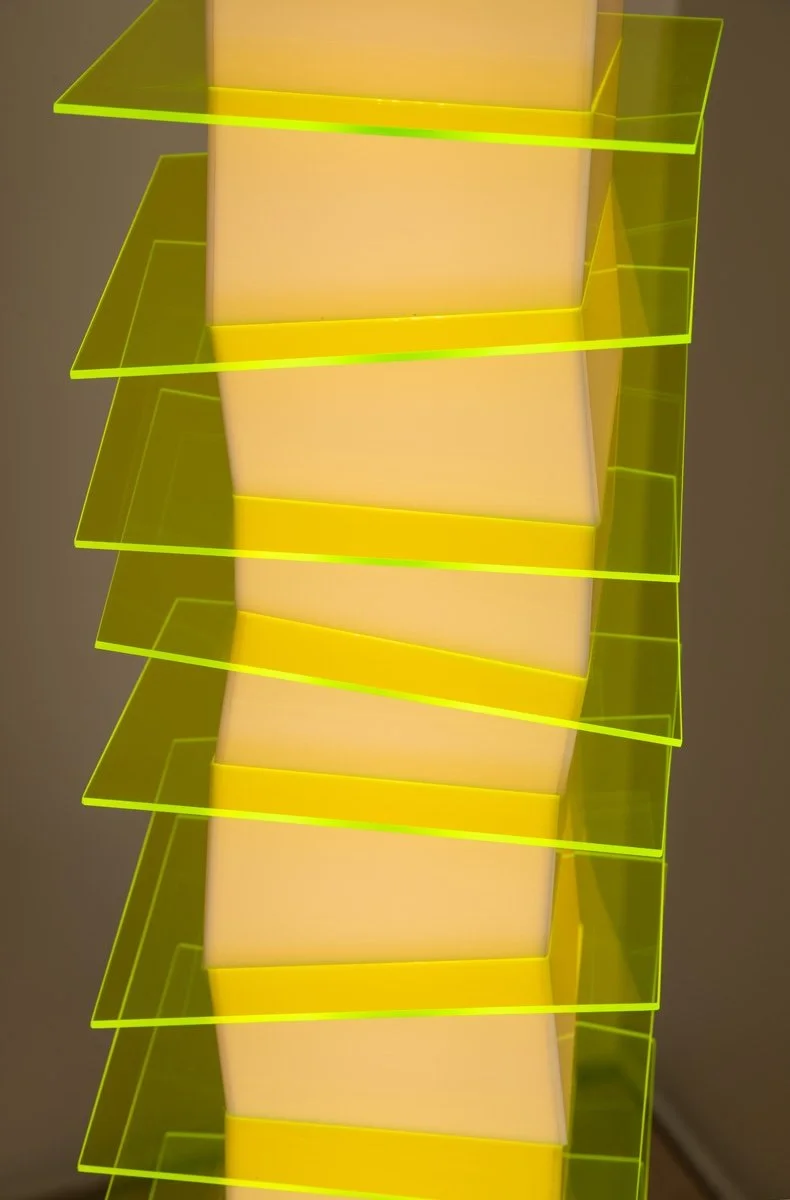 With this work I was seeking a more etherial interpretation of the work that has come to define the “Chaos Series” of light objects. In so doing I have forgone the usual wood frame in favor of one built chiefly of acrylic. Additionally I have taken advantage of the unique edge-lighting properties of neon acrylic to draw attention to horizontal aspects of the form.